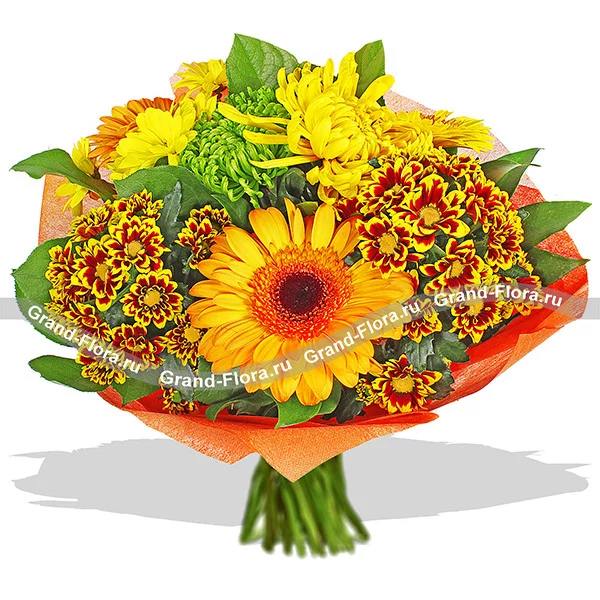 Стандартный (на фото): гербера оранжевая - 3 шт., хризантема желтая одноголовая - 1 шт., хризантема зеленая одноголовая - 1 шт., хризантема желтая кустовая - 1 шт., хризантема кустовая оранжевая - 2 шт., салал, оранжевый фетр.