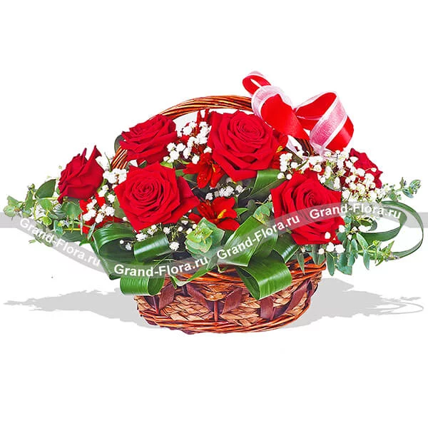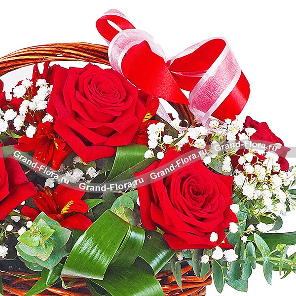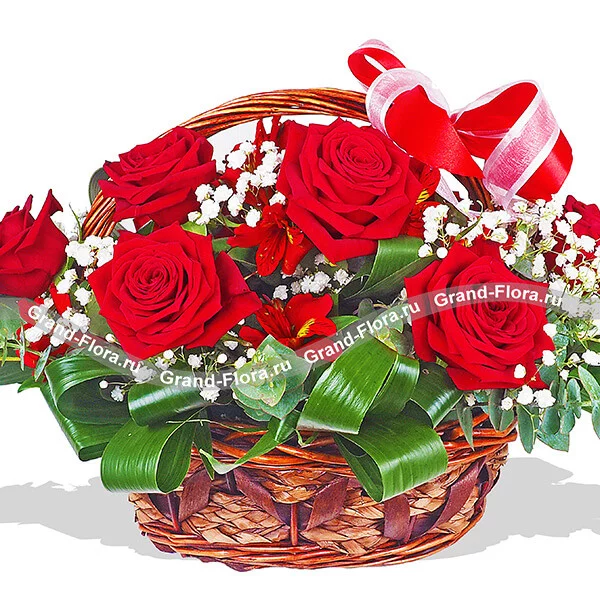 Стандартный: роза красная (50 см) - 5 шт., альстромерия красная - 2 шт., гипсофила - 3 шт., декоративная зелень, оазис, корзина малая, бант красный.