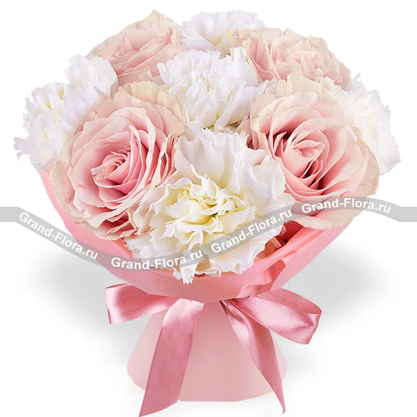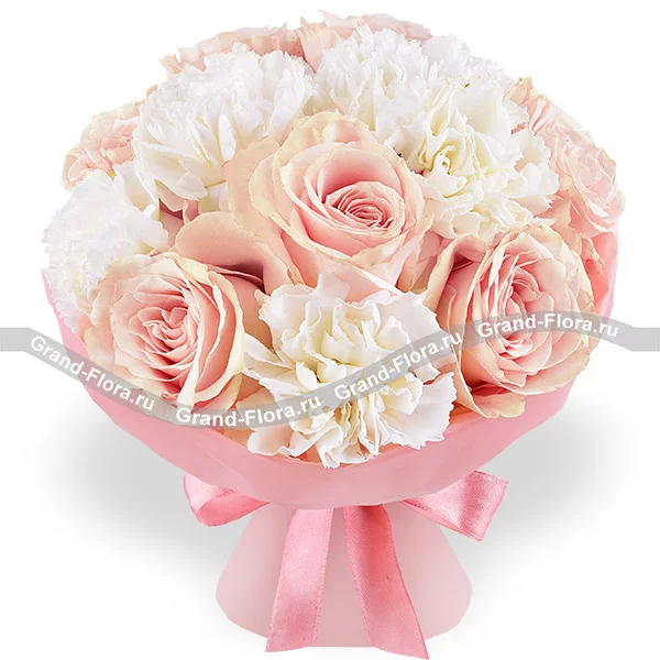 Аромат счастья – букет с розовыми розами и белыми гвоздиками