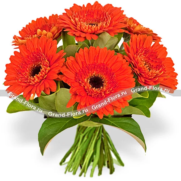 Стандартный: гербера оранжевая - 7 шт., салал - 4 шт., упаковка, лента зеленая.